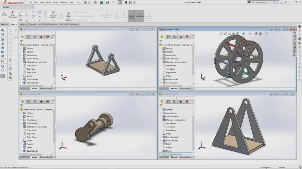 This is a two part SOLIDWORKS tutorial to create an Afternoon Tea Ferris Wheel Toy. In Part 1 of this tutorial you can learn how to draw and create the parts for a moving Ferris Wheel. A range of sketch tools are used in the tutorial including the Circular Sketch Pattern, Offset Entities, Sketch Fillet and the Midpoint Line Sketch Tool.
