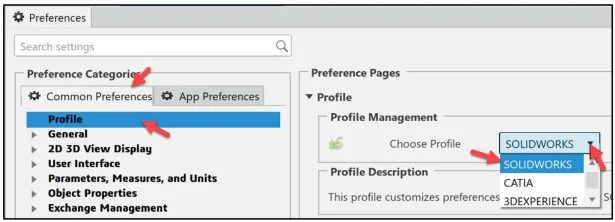 Select SOLIDWORKS from the drop-down menu under Profile Management.