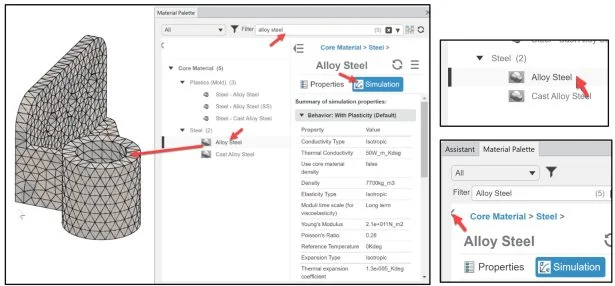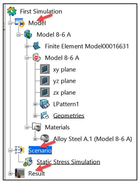 View the Simulation Study tree. The Simulation Study tree displays the object structure. The Material area displays Alloy Steel. The Scenario area displays a Static Stress Simulation.