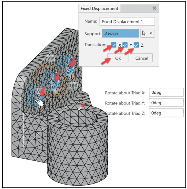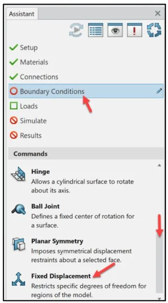Click OK from the Fixed Displacement dialog box. Boundary Conditions display a green check mark in the Assistant.