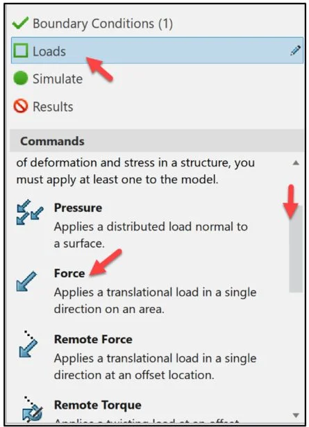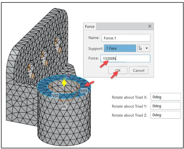 Apply a translational load (13300N Force) in a single direction on a flat face.