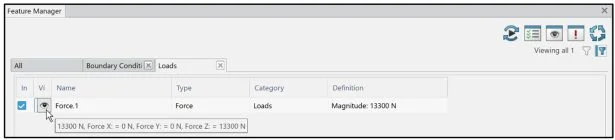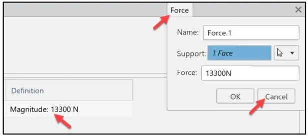 Double-click Magnitude: 13300N in the Definition column. The Force dialog box is displayed. Edit the Force if needed. Note: This will be performed in Lesson 12 Part 2.