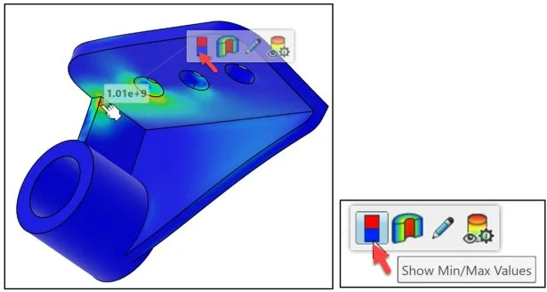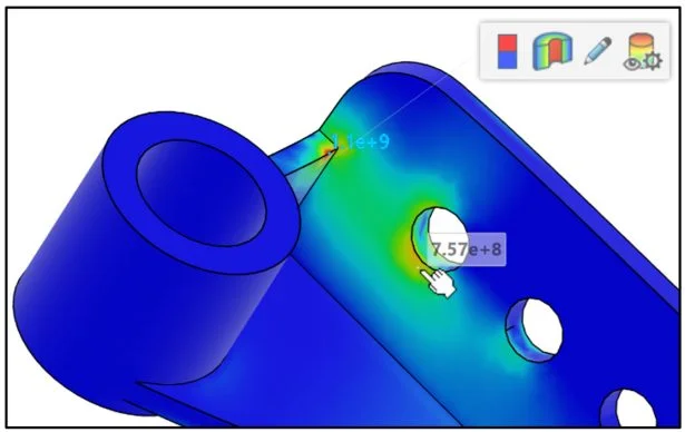The bolt hole closest to the maximum stress also experiences a high amount of stress compared to other regions of the model. When a part sustains high stress values that exceed the material’s yield strength, you need to validate that the part is safe from material failure.