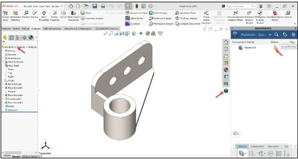 View the Status column in the updated MySession panel. The Status icon displays a green check mark. This means that the current file on your SOLIDWORKS desktop is updated and saved to the platform. The default Revision is A. The Maturity State is “In Work”. This is the default Lifecycle state after you saved the model to the 3DEXPERIENCE platform.