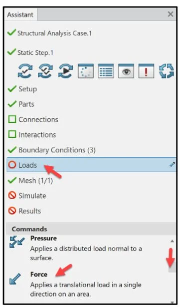 Click Loads from the Assistant dialog box. Click Force from the Commands box. Note: A force consists of three components: Transmission area, Direction and Magnitude.