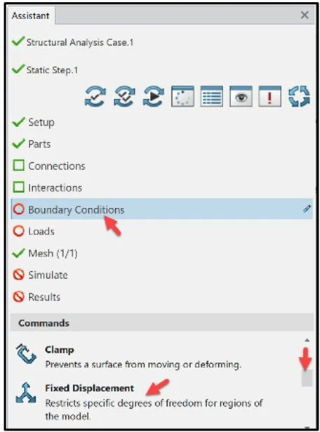 Click Boundary Conditions in the Assistant dialog box. Drag the slider down-ward to view Fixed Displacement.