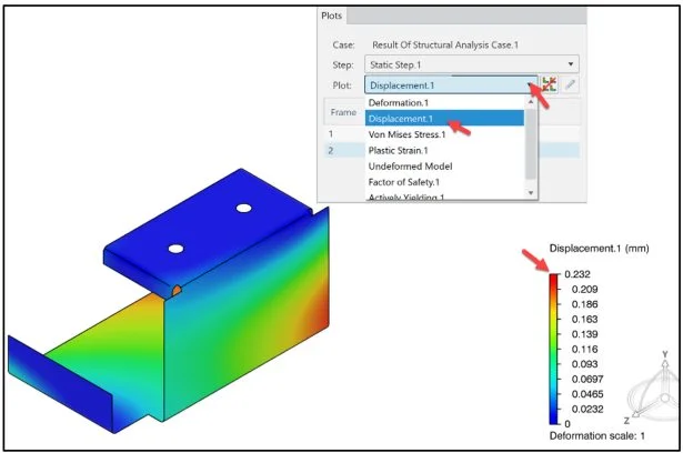 Create the Displacement contour plot. Range from 0 – .232 mm.