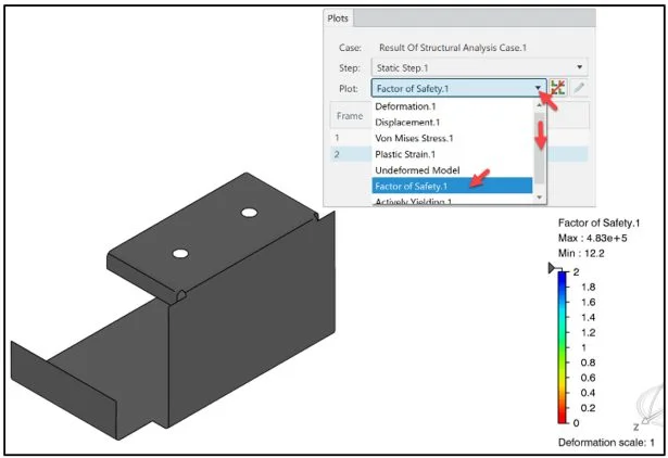 In this example, use the results plots for the Von Mises stress, Displacement, and Factor of Safety (FOS). Verify that the Von Mises stresses do not exceed the material’s yield strength. For most metals, the yield strength is defined as the stress point at 0.2% strain offset. For Alloy Steel this is (6.204 × 108N/m2).The maximum Von Mises stress (5.09 × 107N/m2) is below the material yield strength of (6.204 × 108N/m2).Basics of Stress Limits for 3DEXPERIENCE – YouTube