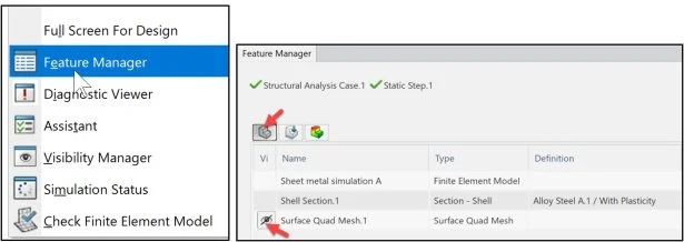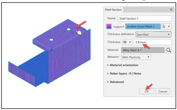 Launch the Structural Model Creation App from the SOLIDWORKS Task Pane. Create an empty Finite Element Model (FEM) linked to the shape of the part. Apply Alloy Steel. Create a Surface Quadratic Mesh. Utilize the Shell Section tool. Define the uniform shell thickness.