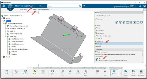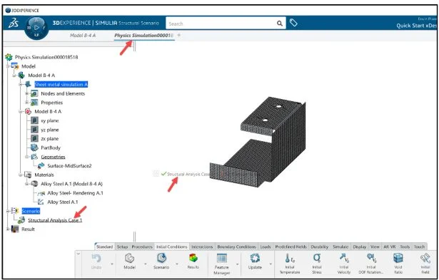 View the updated Simulation study. The Simulation study tree displays the Structural Simulation Process. Model (Geometry, Meshing (Element Family), and Property Definition). Scenario (Simulation Type, Solution Method, Element Type, Boundary Conditions, Loads and Solver). Result (Types of plots, Animations and Tools).