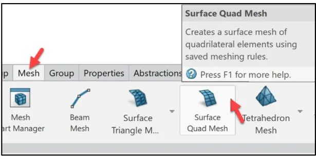 Surface Quad Mesh.1 is displayed under the Nodes and Elements folder.