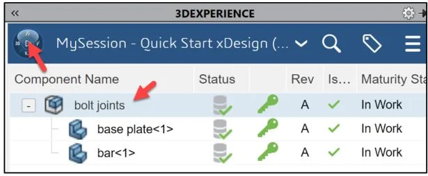 View the Status column in the updated MySession panel. The Status icon displays three green check marks. This means that the bolt joints assembly and reference components in your SOLIDWORKS session are updated and saved to the platform.