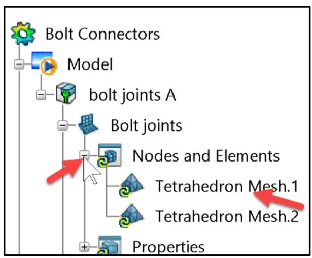 Expand the Nodes and Elements folder. View the created Tetrahedron Mesh for the two parts of the assembly.