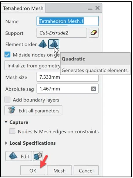 View the default settings in the Tetrahedron Mesh dialog box. Mesh refinement is very important in regions of high stress concentrations such as regions of contact or sharp corners. Typically a smaller element size yields more accurate results, but increases the run time. View the default Mesh size (length of one side of a tetrahedron in a mesh). View the default Absolute sag size.