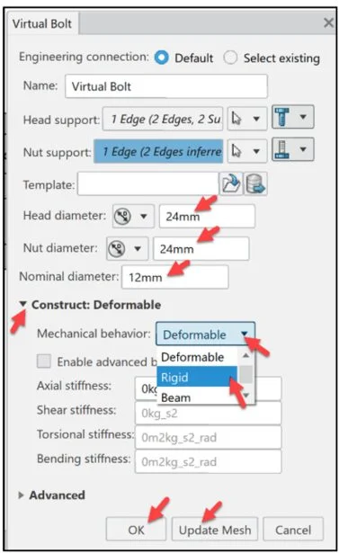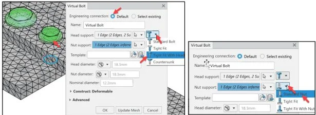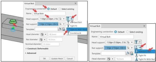 Create two virtual bolt connectors with nuts. A bolt connector joins multiple bodies together or to the ground. The bolts and nuts are not modelled. Bodies joined by the bolts and nuts should have contact interaction defined between them to prevent interference and bonding.
