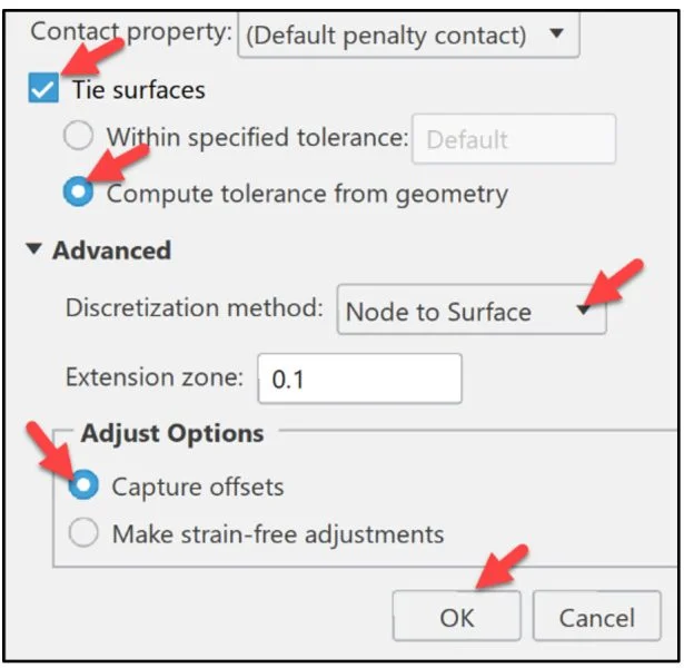 Check the Tie surfaces box. This option ties together surfaces that are within the tolerance that you specify for the duration of the simulation; that is, no relative motion between the surfaces occurs at contacting interfaces. The default tolerance value is 5% of the characteristic element length.