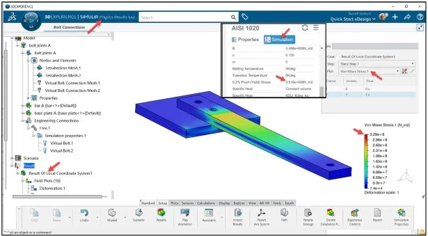In this example, use the results plots for the Von Mises stress, Displacement and Factor of Safety (FOS). Verify that the Von Mises stresses do not exceed the material’s yield strength. For most metals, the yield strength is defined as the stress point at 0.2% strain offset. For AISI 1020 steel this is (3.516 × 108N/m2).The maximum Von Mises stress (3.29 × 108N/m2) is below the material yield strength of (3.516 × 108N/m2 ).Basics of Stress Limits for 3DEXPERIENCE – YouTube