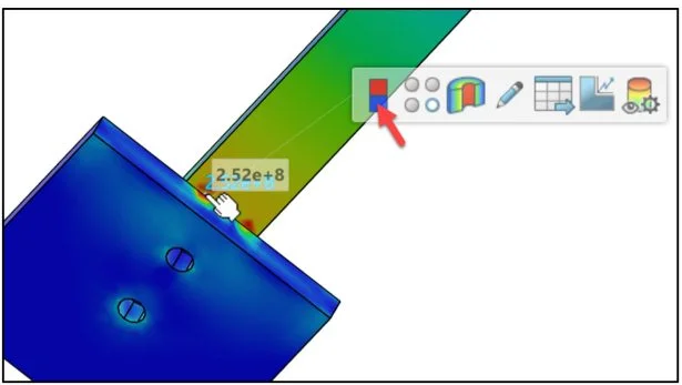 The FOS plot has a maximum limit of 2 by default. Regions of the model with a FOS larger than 2 are displayed in gray. Regions of the model with a FOS less than 1, develop stresses above the material’s yield strength under the current loading conditions.