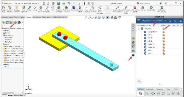 Click Lock from the Pop-up menu. The Lock icon is displayed. Note: the bolt joints assembly is selected in the MySession panel.