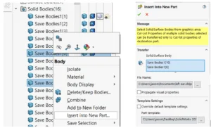 1. Using insert into new part, you can save out one or more solid bodies into a new part file, to do this, simply right click the solid body/bodies you would like to save as a new part file: