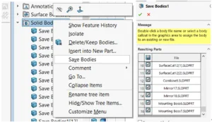 1. If you want to save all solid bodies into separated part files, you could use “save bodies” instead by right-clicking the solid bodies folder, you could even create a new assembly at the same time: