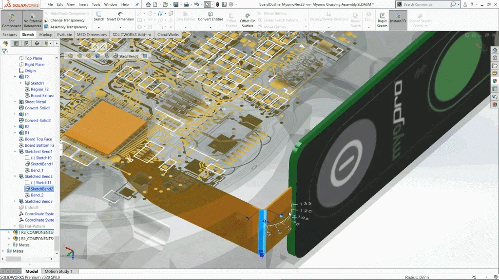 Now, with the SOLIDWORKS 2020 release, electronic product design and the collaborative workflow have been significantly enhanced with Rigid-Flex support, in-context editing, and programmatic synchronization for both PCB and mechanical designers. No longer do designers have to struggle to ensure the flexible PCB will fold and fit correctly relying on outdated, unintelligent collaboration mythologies from the commonly used paper doll to creative workarounds with sheet metal to overly simplistic bits of string.