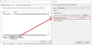 The Actions tab allows targeting of the key application. The default path for the executable to run in the task schedule is below; target the ewenvironmentarchiver.exe, and when added, edit it to include “runwithlastoption” in the program’s execution.