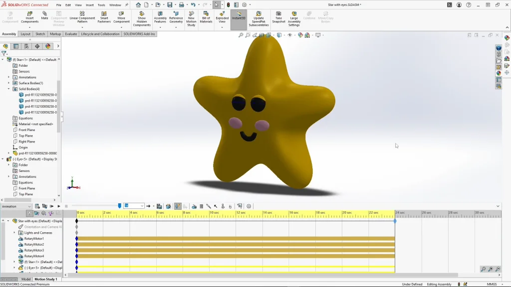 As a Mom of two boys, I have watched my fair share of baby sensory videos on YouTube, and they are super cute. So, I began to wonder how easy it would be to model and animate my very own mini sensory animation video. For part 1 of the tutorial, you will see how I used xShape to model a star, bring it into SOLIDWORKS Connected from the 3DEXPERIENCE Platform, and add moving eyes using a motion study. Stay tuned for part two of this tutorial, where I will be bringing in the star with motion study information into SOLIDWORKS Visualize Connected and will animate it to move around as if it were dancing to a lullaby. You will see at the end of part 2 of the tutorial the final rendered animation that was edited to have lullaby music in the background. You can get access to all of the above-mentioned packages and more under the 3DEXPERIENCE SOLIDWORKS for Makers offer from Solidworks.com.