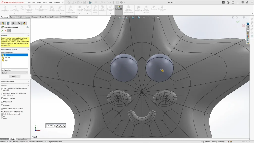 The eyes were dropped near the star, they weren’t mated into place, this wasn’t necessary for the assembly, especially as the motion study type I created was an animation, not motion analysis. Moving onto the motion study part, before I could animate the eyes, it’s important to remember that the eye subassemblies need to be made flexible, otherwise the eyelids will be fixed, you have to do this to for both eyes. Then I also need to delete the limit angle mate.