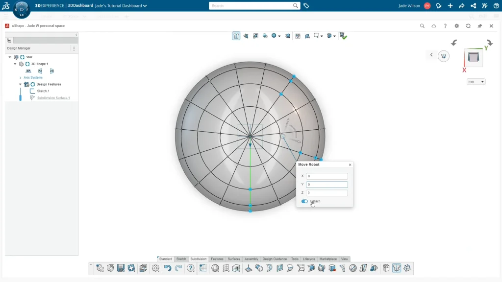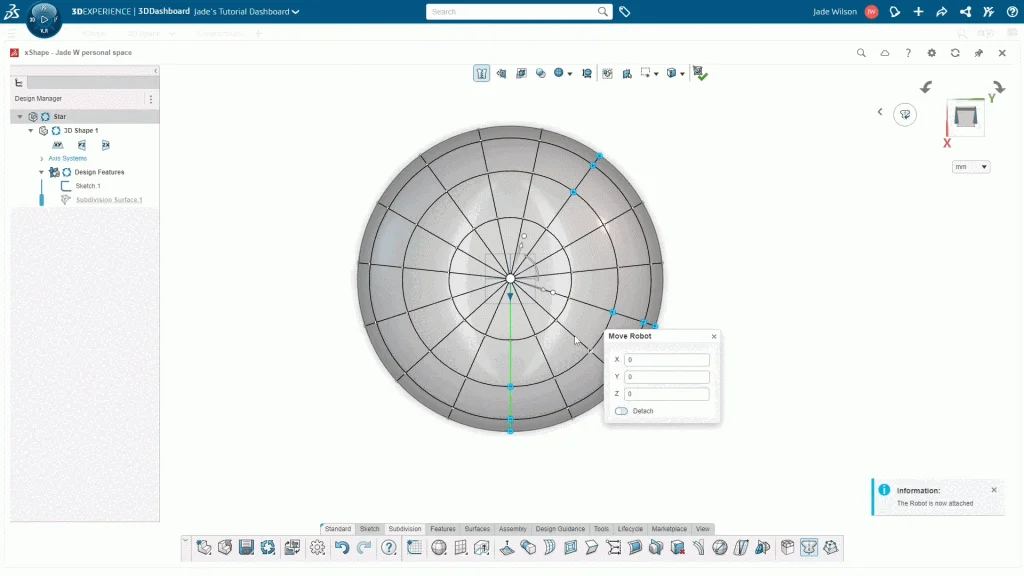 Selecting the two scale control points holding shift and I can scale and drag these points inwards creating a star shape, and you’ll see as I do this, the opposite side of the surface is symmetric. I could have created the star without the symmetry tool and just selected the opposite points on the globe, but I wanted to demonstrate the symmetry feature, as well as the ability to move/detach the robot.