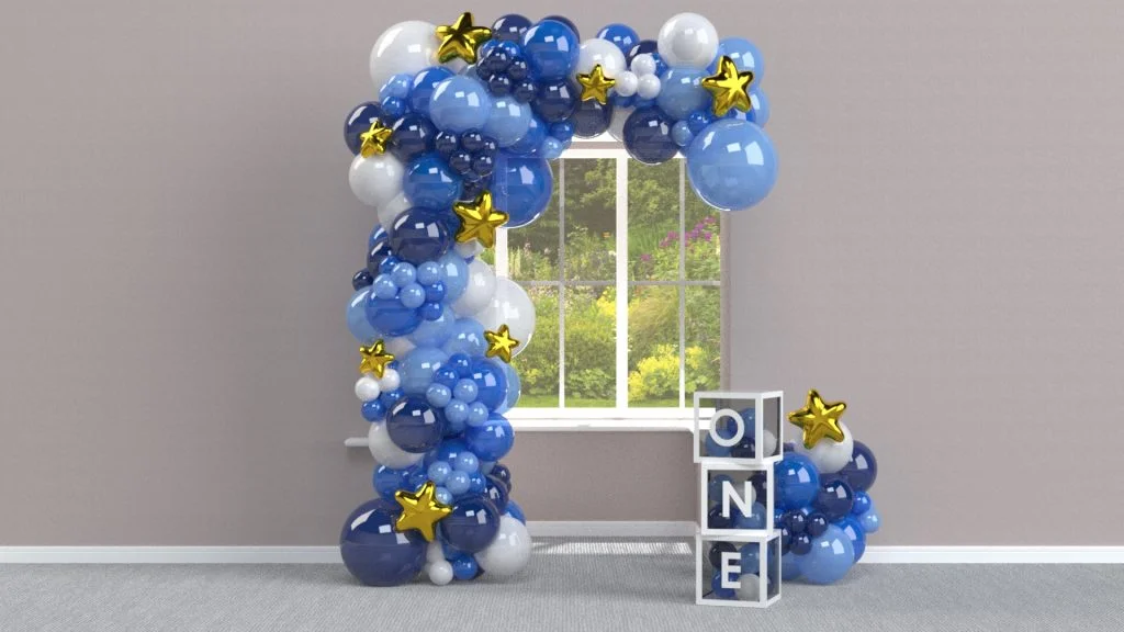 Finalizing the balloon arch, I added some star shaped balloons using a star model I had created from a previous tutorial here modeled in xShape. The party theme will be twinkle little star so this will finish the arch nicely. I used two different sized stars that I placed around the arch, spaced apart and dragged into place against the arch, sometimes rotated to appear more natural.