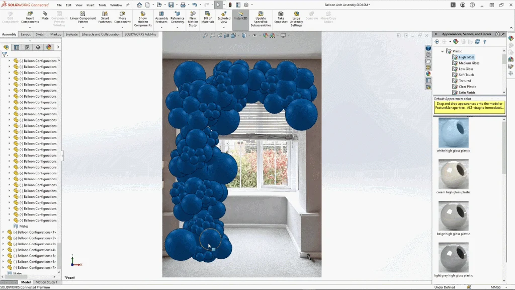 With everything in place, I saved the assembly. The great thing about this model is that I can use a bill of materials to check how many of each balloon I’ll need to create the final design. It will stop me wasting money, but it will also help when it comes to my son’s birthday and I’m creating his balloon arch, I can use the rendering and model as a reference to duplicate it. You can see below a rendering of my balloon arch which I created in SOLIDWORKS Visualize.