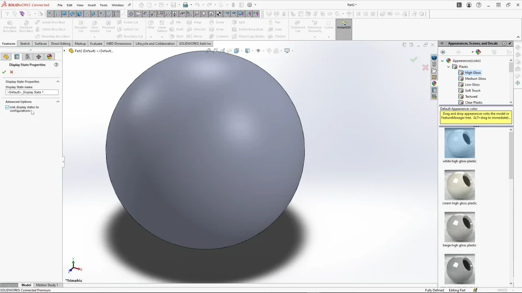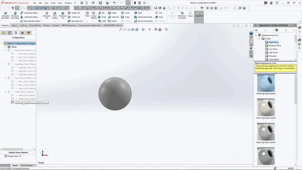 Because I’m creating different balloon colors, I went to my display state properties, and turned on ‘link display states to configurations’. This will allow me to change balloon colors between configurations, and it wouldn’t affect previous configurations.