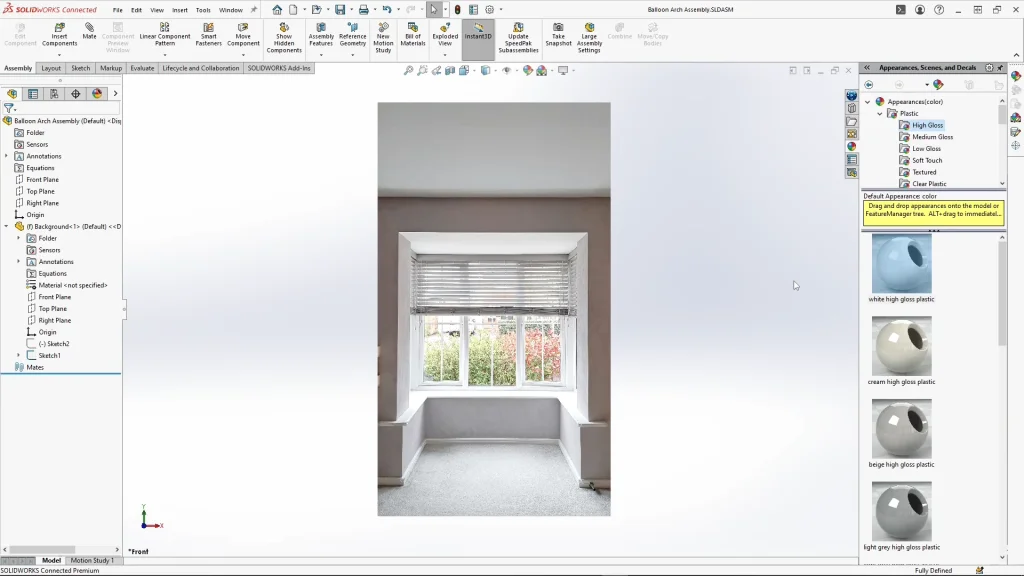 Yes, modeling a balloon arch in SOLIDWORKS for my son’s birthday may be a little extreme for some people, but I am a planner! and it has its uses, so let’s dive in! As a guide for my balloon arch, I used a photograph of the space in my living room where I will be assembling the arch to map out where the balloons will go. The photo has been enlarged to scale to ensure the balloons fit and will help me to determine how many I will need for when I build the real thing. I have my image already within the assembly I will be using to create the arch.