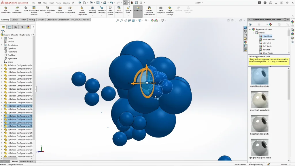 At this stage, I could make an assembly from part. Selecting the pin within insert components to drop in multiples of the part, in this assembly I’m forming a balloon cluster. This is how balloon arches are created, using separate clusters that are tied together. For the cluster, I dropped in the blue 12-inch balloon first in groups of two as this is how the balloons are tied up. Once these are in, I’m able to select a balloon and change their size using the configuration drop down, I didn’t change the colors at this point to keep it simple. There’s no real right or wrong way to do this part, but I try to arrange the balloons into a random cluster where the balloons may cross into each other slightly, with the aim to close-up some of the large gaps. I didn’t place any large balloons into the cluster as they act as feature balloon to the complete arch, so they’re added to the final assembly. When it comes to the smallest 5-inch balloon, I inserted these into small clusters of their own ranging from 5-7 in each grouping, these act as gap covers for the larger spaces seen through the other balloons. When multiple balloons/components are selected, you can select one from the tree holding control and the transform arrows will appear allowing you to move and rotate multiple parts at once, making it much quicker to form the cluster.