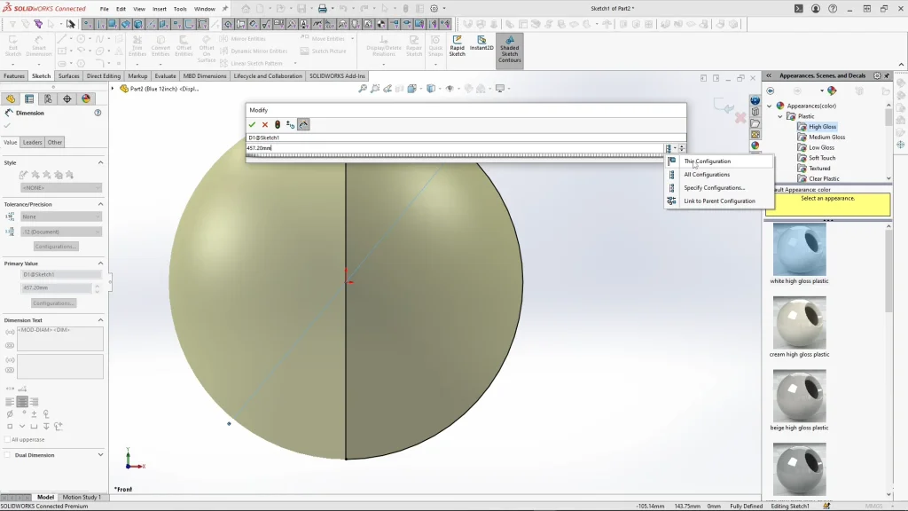 My first configuration, I applied a blue appearance and renamed it, “Blue 18-inch balloon”. From here, I could then right click onto the configuration and add a derived configuration, I repeated this process for each of the other 3 balloon sizes. When creating other balloon sizes, I edited the revolve sketch, but before I input dimensions, I changed the configuration option dropdown to only apply the change to the current configuration. From here I could input 12-inch into the dimension box and apply it, creating a new derived configuration of the blue balloon.
