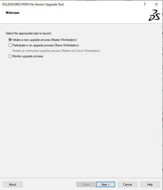 The default option when starting a new upgrade process is “Initiate a new upgrade process”. If you are planning to split the workload among several workstations this option still needs to be run on the master computer first to generate the work instruction files.