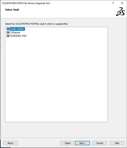 Select your PDM file vault where all your files that you want to upgrade are stored as shown below. You may be prompted to log in if you have not already. NOTE: Make sure you sign in as a user who has the required permissions to read and check out all the files you wish to upgrade irrespective of what state and workflow, they reside in. Hence, it is advisable to use “ADMIN” user.