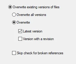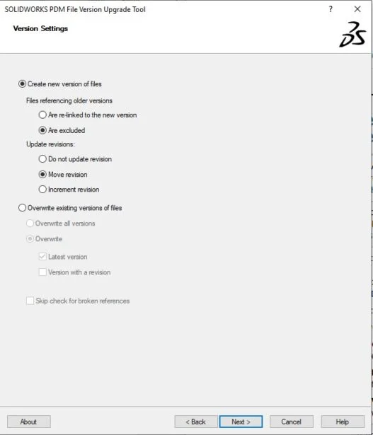 If you want to upgrade a specific version of the file and replace the existing version with the upgraded files, you can go with the second option to “Overwrite existing versions of files”. With this option you can either choose to upgrade all existing versions of the files or only the latest version of files in combination with files that have a revision tag. NOTE: Upgrading all files in the vault can be time consuming hence its recommended to clear the check box for the “Skip check for broken references” option to ensure that any parent files referencing the files chosen are also upgraded.
