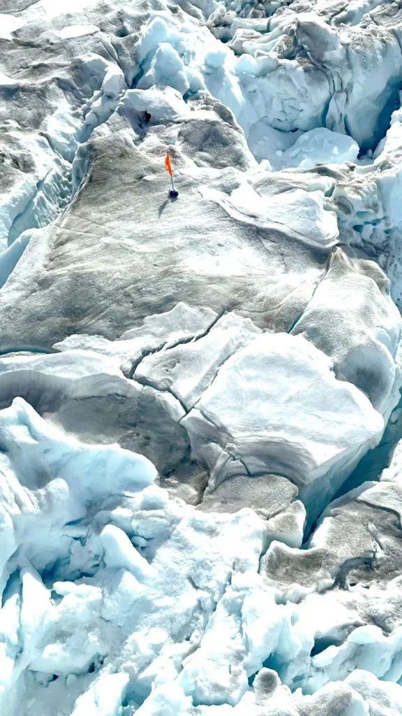 This brings us back to the colorful carpeting of a hotel room in Tasiilaq. The team assembled the sensors, which were white and blue in honor of Randall’s alma mater, and then loaded the devices and themselves into the helicopter. They flew to various destinations along the glacier, hovering long enough to drill a hole into the ice to screw a sensor and flag into place. They repeated the motion for all 40 sensors over the course of two weeks. With the drone, they mapped the area in 3D.