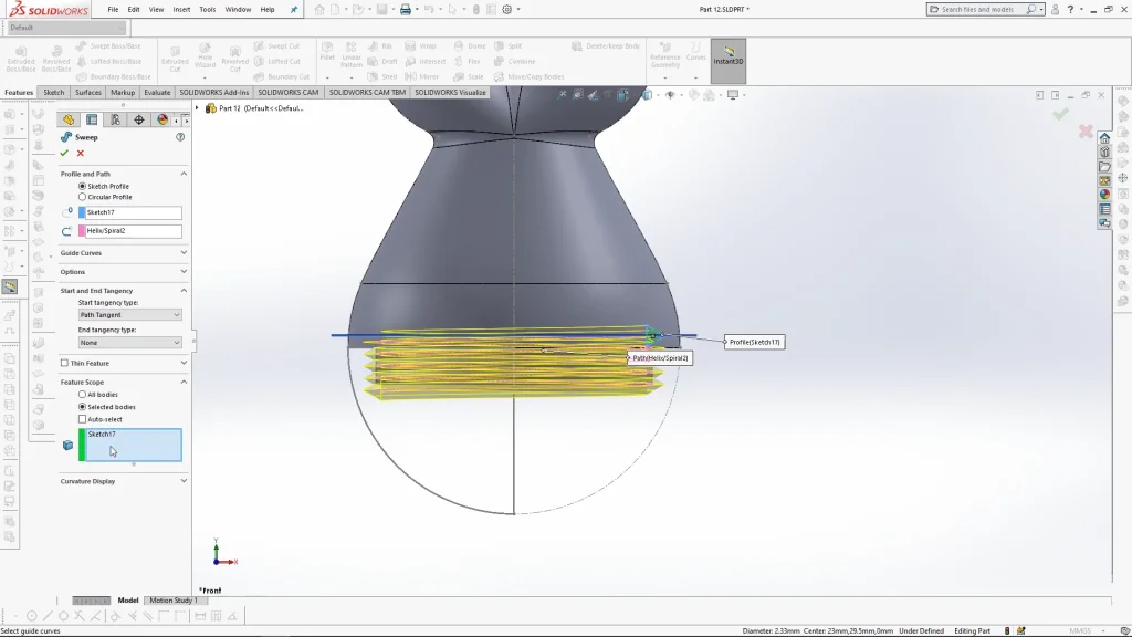 The two parts of the toy are held together by a screw fastening which was created using a sweep. A copy of the sweep body is the combined and subtracted from the base part to create the negative of the fastening. The tutorial also shows how a swept cut was used to add tolerances for the 3D printing material to allow for the parts to screw together with ease.