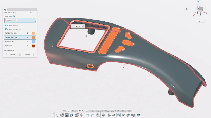 When you hit okay in the Parting Lines command, you’ll get a pop-up for the Shut Off Surface command, which is signaling there are holes in the part (multiple parting lines) that you need to shut off to create the surfaces. At this time, you can get visual feedback on the holes in the part, whether they are tangent filled holes or unfilled holes. And you can control the continuity of the holes and determine if you need to do some surface modeling or have it automatically create the surfaces if it looks good to you.
