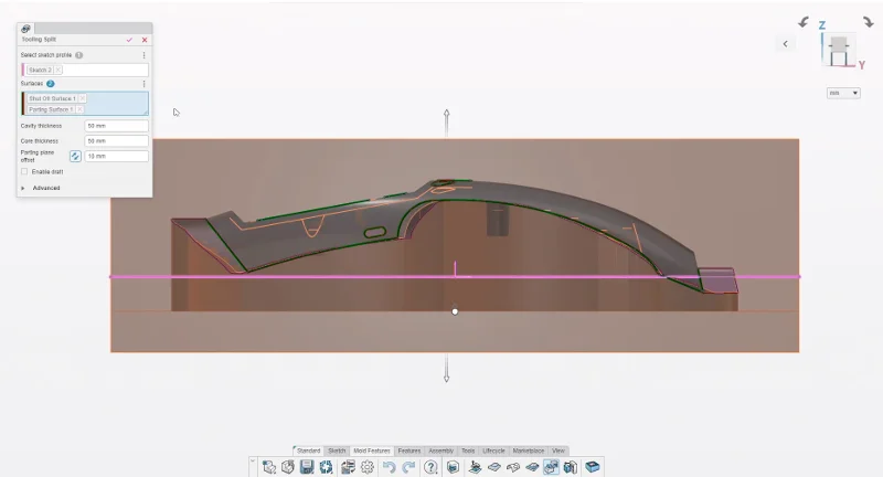 At this point you can thicken up your core or cavity by tweaking the values. There’s also a Parting plane offset where you can tweak that value as well. You can also add Draft during this phase and there are other advanced options.