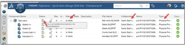 The orange save Status icon for the Ball valve assembly and reference components informs you that the local files on your computer have not been saved to the platform. Save the assembly and reference components to the 3DEXPERIENCE platform.