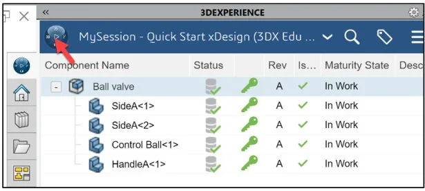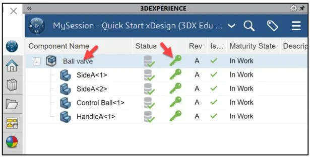 View the Status column in the updated MySession panel. The Status icon displays a green check mark. This means that the current file on your SOLIDWORKS desktop is updated and saved to the platform. The default Revision is A. The Maturity State is “In Work”. This is the default Lifecycle state after you saved the model to the 3DEXPERIENCE platform.