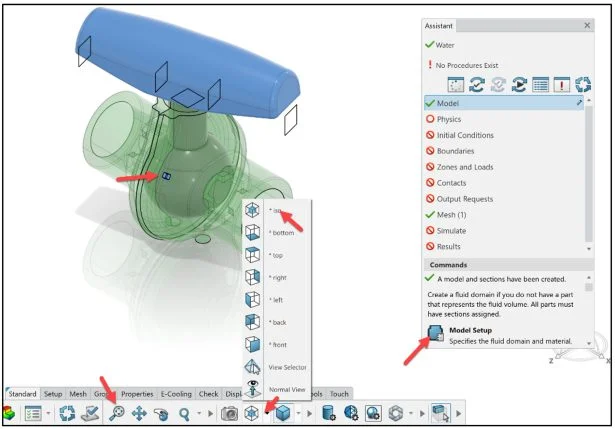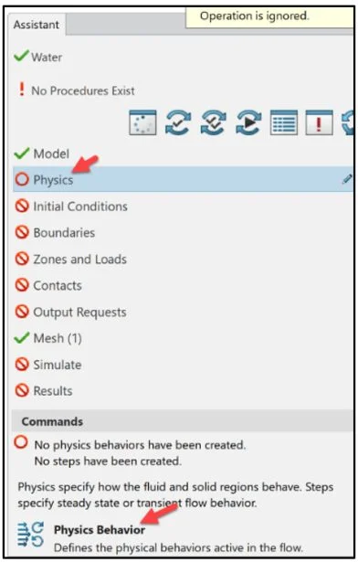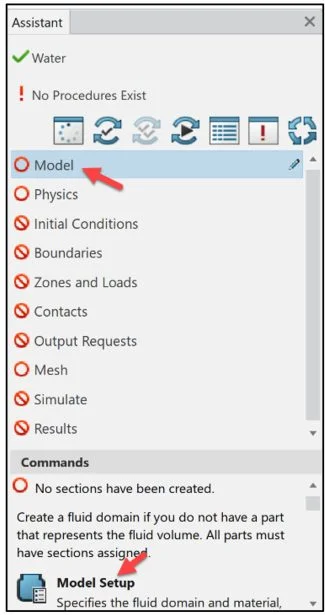 The Assistant dialog box is a helpful tool which guides the user through the Fluid Simulation process. The Assitant dialog box should be followed from top to bottom.