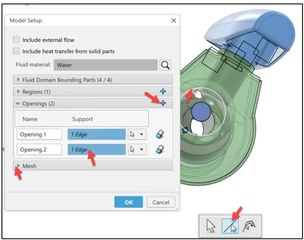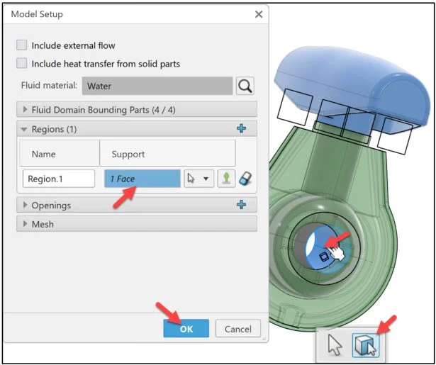 Click Opening.1 (inlet) from the Graphics area as illustrated. Opening.1 is displayed in the Support box.