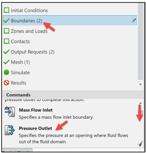 In this lesson, create two output requests. The first output request is for the inlet pressure and mass flow results. The second output request is for the outlet flow velocity and mass flow results. Use this information to confirm that the Simulation converged properly and to analyze the valve’s performance.