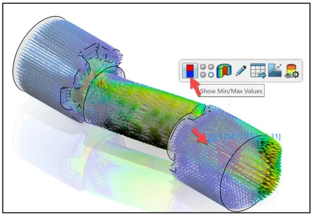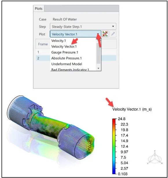 Click a point on the model as illustrated. View the Velocity Vector at that point. A Pop-up menu is displayed. Note: to deselect the displayed point, click in the Graphics area.