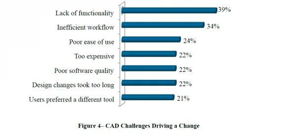 According to the white paper, the most common reason for making a change is the existing tool lacks needed functionality. An inefficient workflow, such as too many mouse clicks or a user interface that is not intuitive, is another top reason. In these cases, companies likely turn to a different CAD tool with an expectation that additional functionality and a more efficient workflow will improve their productivity. After all, the faster you can create, manufacture and ship a product, the higher the likelihood that you’ll be capturing market and mind share of consumers.